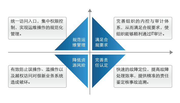 各种权威的网络安全调查结果均表明,在可统计的安全事件中,60%以上均与内部人员有关,这其中既包括恶意行为(越权访问、恶意破坏、数据窃取),也包括各种非主观故意引起的非恶意行为(误操作、权限滥用)。由此可见,规范内部人员的访问行为,特别是核心系统(主机、网络设备、安全设备、数据等)的维护行为势在必行。